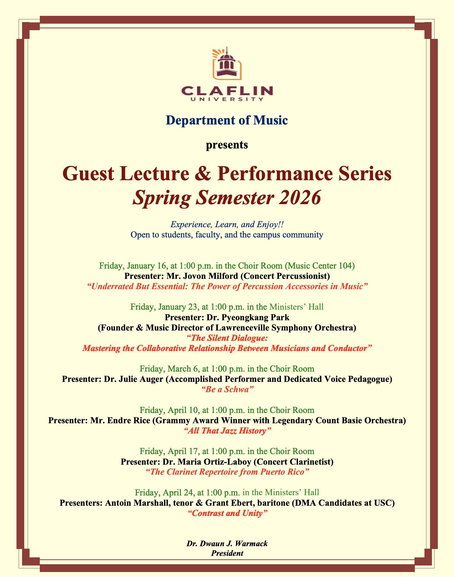 We are excited for your interest in Claflin University, and we hope to make your audition process as easy as possible. If you have any questions about the Department or Audition process you can set up a meeting by contacting the interim department chair, Dr. Isaiah McGee (imcgee@claflin.edu ). You may also e-mail any of the faculty directly if you have questions about Claflin, the music department, or the audition process. The contact information for the full music faculty can be found on the Claflin University Department of Music website.