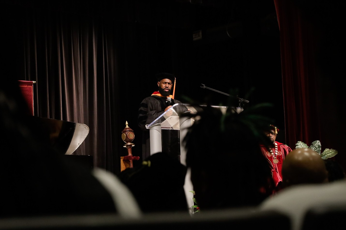 Claflin alum Travis J. Simons speaks Sept. 23 at the matriculation convocation. (Panther photo by Rebekah Bishop)