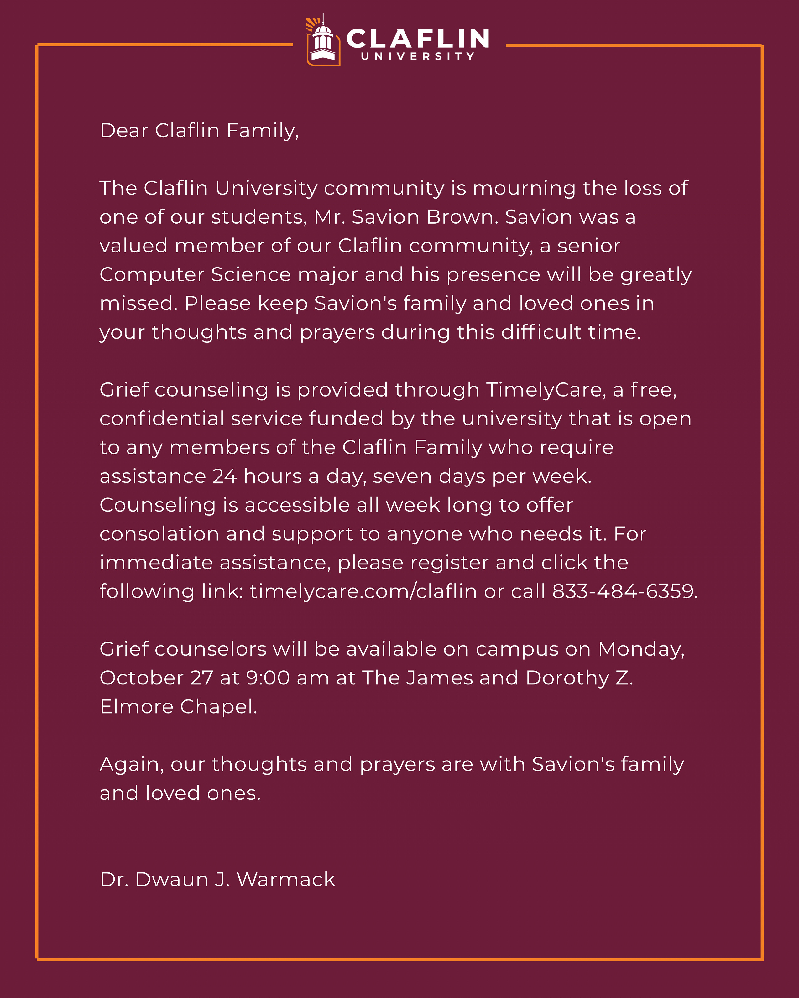 In addition, students have 24-hour access to free, confidential counseling through TimelyCare, a support service available to all Claflin students. Email timelycare.com/Claflin.edu or call 833-484-6359.