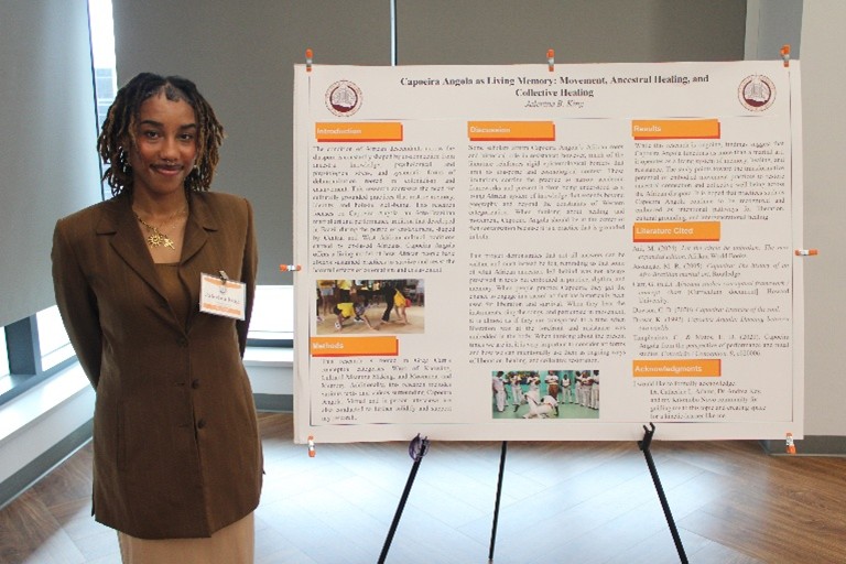 King, an African and African American Studies major with a minor in psychology, presented “Capoeira Angola as Living Memory: Movement, Ancestral Healing, and Collective Healing.” Her research explores how Capoeira Angola — an Afro-Brazilian martial art created by enslaved Africans — helps people reconnect with culture, identity and history.